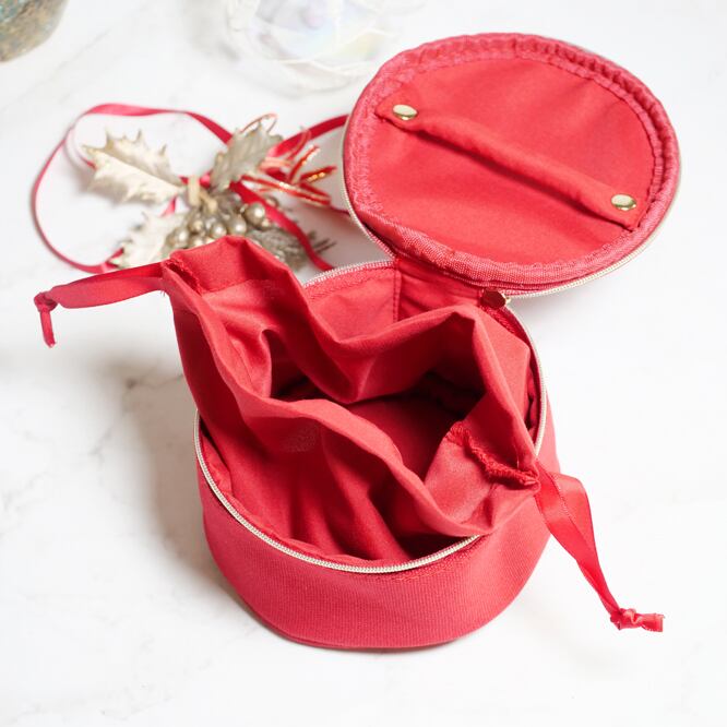プレゼント品のポーチですが、コットン素材で優しい手触り。赤とゴールドの上品でモダンなジュエリー&コスメケースです。マリアギャランのロゴ入り。小物収納にも長けています。内側は、きんちゃくになっています。かわいいサークル型がたまりません。(サイズ:直径12×高さ6(mm))
